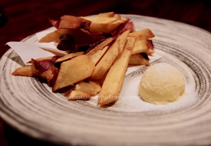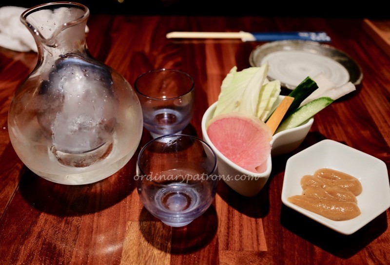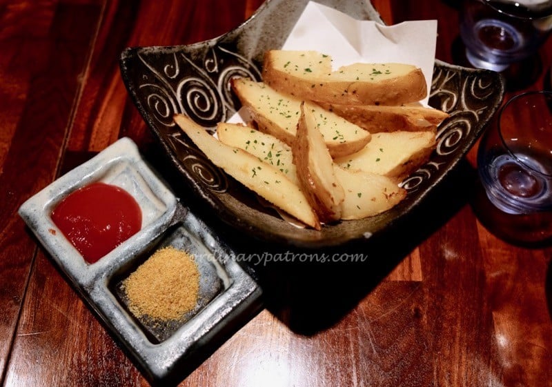 Looking at our neighbouring tables, we noticed that drinks flow at a rapid rate at Gonbei Japanese izakaya. We think it is quite natural because the types of food – either grilled or deep-fried go so well with a cool drink. Plus, the prices are quite reasonable – around 500 Yen for a beer and 750 Yen for a small carafe of sake. So when in Osaka we did what the local folks did. Like most of the people here, we rely on walking or public transport and so there is no fear of drink driving issues. The potato wedges and sweet potato fries were a nice start to the meal. The sweet potato was really sweet. Dipping them into the ball of butter was a new way of eating it.