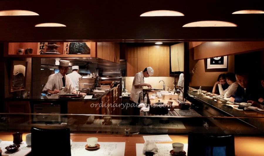 Naniwa Kappo Kigawa was humming with business when we arrived. It is a dimly place with all the cooking done right in front of diners. We had two ringside seats at the counter with full view of the action. It was a smooth operation with the chefs churning out dish after dish without much overt communication.