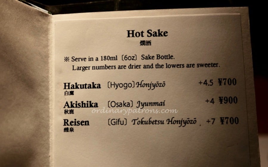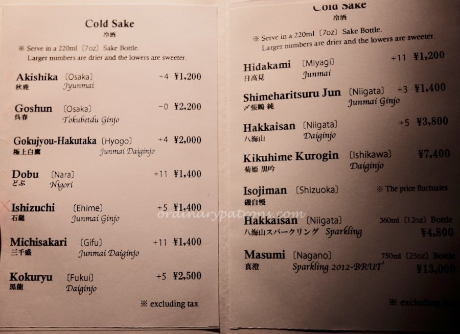 Here are pictures of our lunch menu and portions of the sake list. We had a few types of sake (cold and hot) to go with our meal.