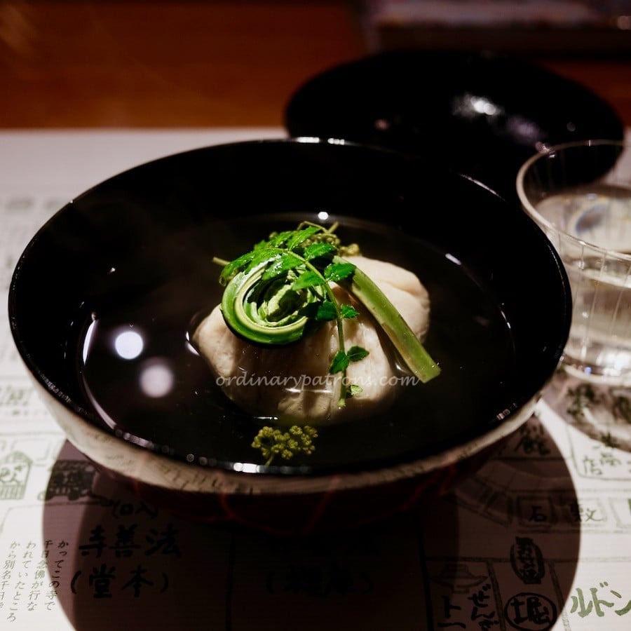 After the sashimi, we had the soup and the grilled dish. Both were exceptionally good. The soup of bamboo shoots and sea bream dumpling was clear and light but contained a complex, pure taste.