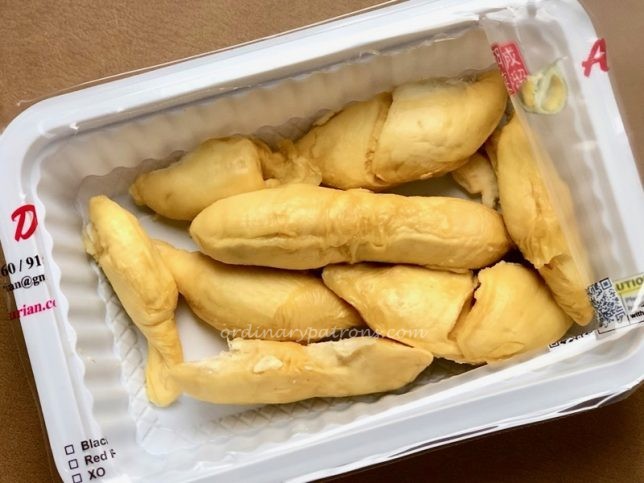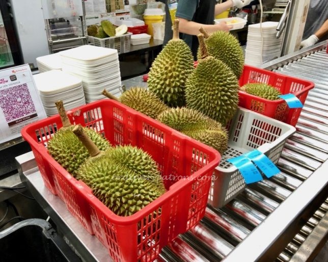 Ah Seng Durian encourages their customers to make reservations by phone or sms. Their prices are shown at the store and on their Facebook page which also contains instructions on how to place your orders. Making a reservation is a good idea but not for people like us who make decisions like this on impulse. We went to Ah Seng Durian Ghim Moh Market at an off-peak time around 3 pm on a weekday. It was a good time as there were only a few people in the queue. But not good enough as their most sought after item, the Mao Shan Wang (猫山王) durians were sold out – reserved in advance by more organised people. We had to pick from the remaining ones. That was how we ended up with Gang Hai (江海) durians. A type which we never heard of and so decided to try it.