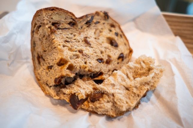 We had the loaf sliced into eight pieces. This is a picture of one slice. It looks like a normal fruit and nut bread but the main difference was the smell and taste of dried longans. It was certainly unusual and attractive. We did not detect any red wine taste. The bread felt dense and chewy. The surface skin of the bread was tough, especially the thick layer at the top of the loaf. The insides were more yielding and easy to eat. Would we order this again? Probably not, unless it is for a person who has never tried this before.