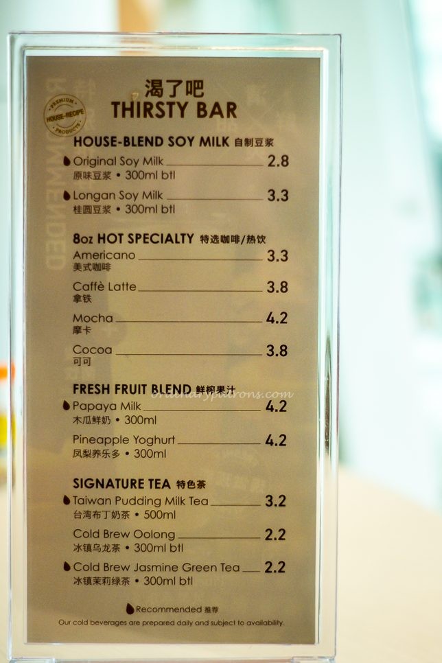 Pick up the bread of your choice and pay at cashier. Customers can pack them home or eat them at the Wu Pao Chun Bakery premises. Tables are provided for in-store diners but no plates or utensils were provided. A basic drinks menu of coffee, tea, soy milk and fruit blends is available.