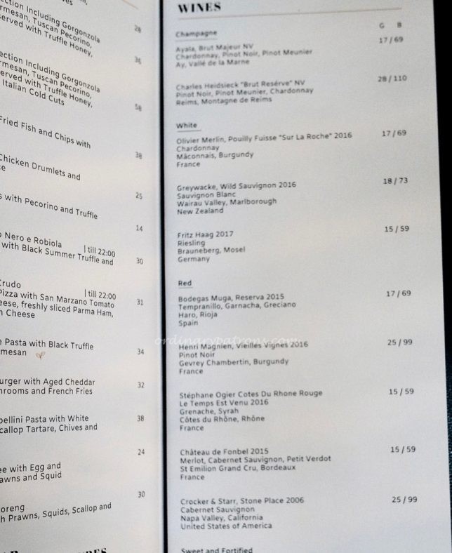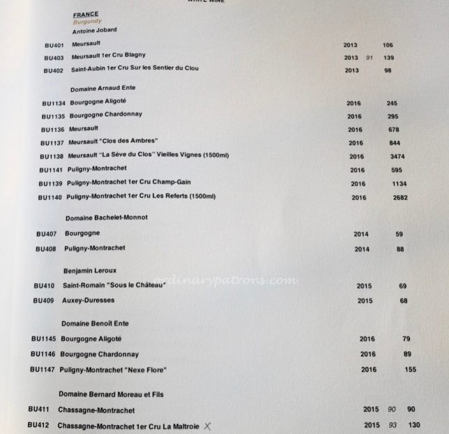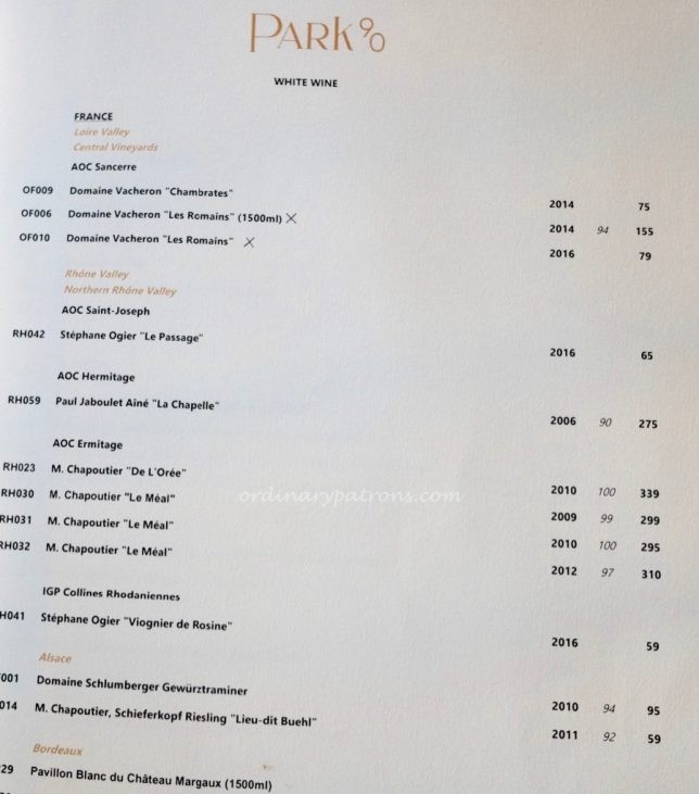 Here are pictures of sample pages from the Park90 wine list and food menu. The range of wines available starts from around $60 to the wallet-busting bottles from Burgundy, such as the legendary Domaine Romanee Conti, Romanee Conti. The 2009 DRC is priced at an eye-watering $27,500. 15 types of wine, mostly affordable labels, are available by the glass.