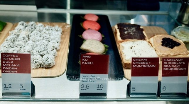 PPP Coffee had a small selection of food items to go with the coffee. The small cupcake-sized pastries cost around $7 each. There were some local items as well such as ondeh ondeh and ang ku kueh ($1.2 and 2.5 each respectively).