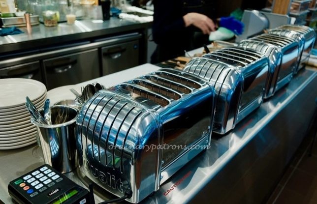 In addition to the decor, the cafe hardware also looked impressive. The coffee machine looks like a spaceship. The train of stainless steel toasters looked the part as well.