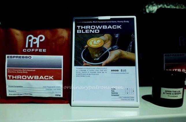 I had a cup of large cappuccino ($7). The taste of the coffee was superb. Strongly flavoured but not overpowering. The taste lingers on pleasantly on the palate. I was told that they use the Throwback blend of coffee for the cappuccino. They sell them in packs of 250g at $16. The taste is described as “Dark Chocolate, Rich Hazelnut Overtone, Heavy Body”. All I can say it is worth visiting PPP Coffee to have a taste of this.