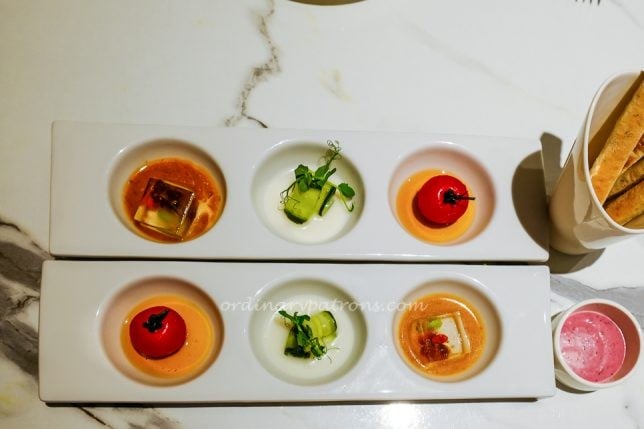 Our meal began with a “classic starter” as well as truffle bread sticks with a blueberry yogurt sauce. We liked the breadsticks and the dip. The truffle flavour was subtle and not over-powering. We were less enthusiastic about the three-piece starter, especially the sour tomato.