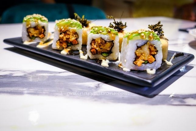 For main courses, we had the stir fried angel hair pasta in black truffle sauce and the tempura tofu and avocado roll. We were not impressed with either one. The pasta was soft and almost soggy. The rice of the avocado roll was mushy with the individual grains of rice was hardly discernible. On the positive side, the presentation of the rolls was very well done.