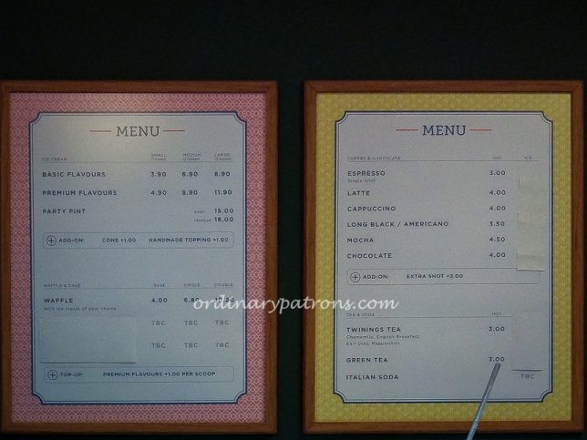 The items on the menu are reasonably priced. A single scoop of ice cream starts at $3.90 and waffles with double scoops are $10.80 and a cup of latte is $4.