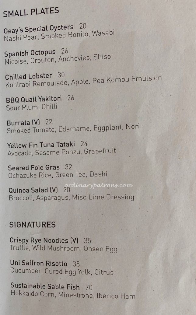 We tried almost all the appetisers – Salmon tataki, smoked duck, tomato miso soup, oysters and foie gras. The last two required an extra payment of $12 each. They were all good. The best ones were the soup and the oysters.