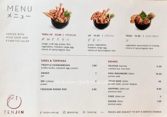 Tenjin is another new restaurant in Shaw Centre by the Les Amis Group. This new restaurant specialises in tempura donburi or tendon for short. In case the name “Les Amis” makes you imagine dollar signs flying out of your wallet, don’t worry. The tempura rice bowls at Tenjin are quite reasonably priced.