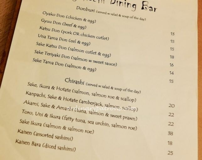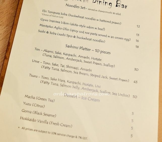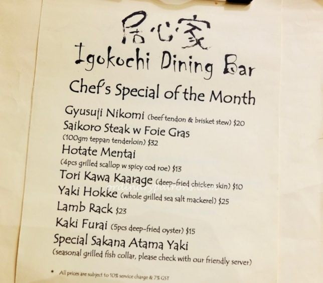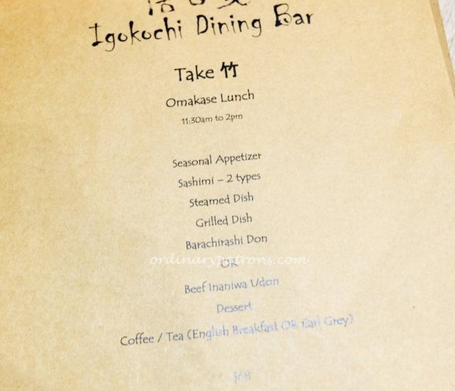 Igokochi Dining Bar is an attractive Japanese restaurant in the suburban NEWest Mall in the West Coast of Singapore. The decor is tastefully done and the menu is extensive. The meal options range from a $138 omakase dinner to a $9.90 lunch special. We are ordinary patrons, so you know which end of the spectrum we ended up with on a recent visit!
