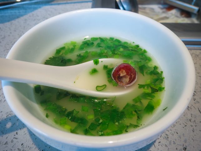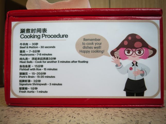 At the side of the tissue box on the table were cooking instructions so that the food would not be undercooked or overcooked. The impressive service at Haidilao Hot Pot would include helping you with scooping the soup onto a small soup bowl and adding chopped scallion and parsley to the soup.