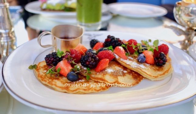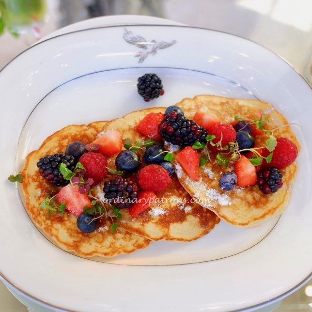 Both our breakfast dishes were beautifully presented. The smashed avocado and poached eggs (picture above) was served on rye toast. The pancakes were even prettier. Both were good – pretty much as one would expect of these dishes, but were not exceptional. But eating them in the sparkling restaurant made them more enjoyable than normal. We thought that the prices were very reasonable.