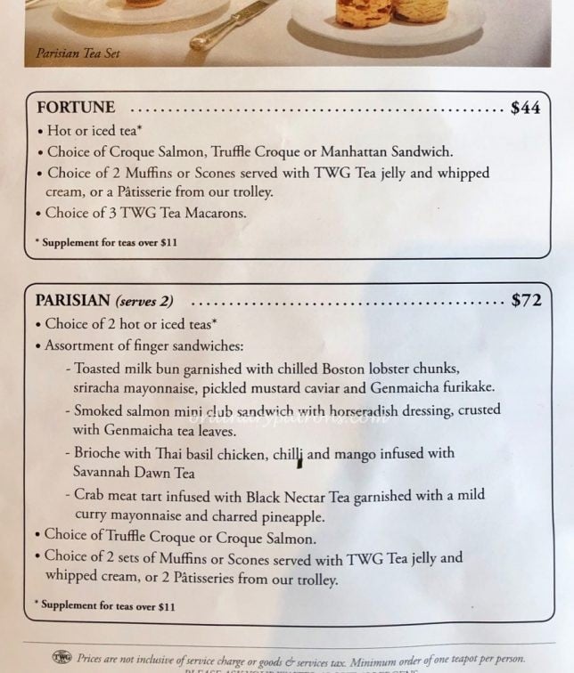 The range of food served at TWG Tea Salon Takashimaya is quite wide. They serve more than just cakes and scones. Mainstream restaurant dishes like mushroom soup, lasagna and eggs Benedict are available on the menu. But what we were most interested in were the TWG Tea Time selections. There are several tea time set menus. We had the “Parisian” which serves two persons and cost $72.