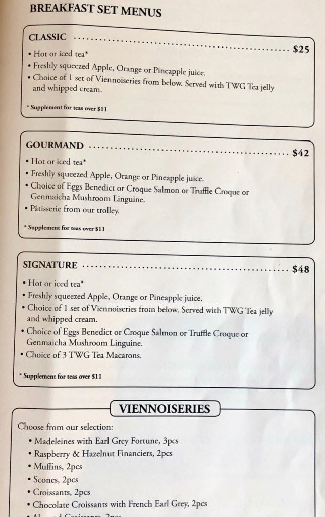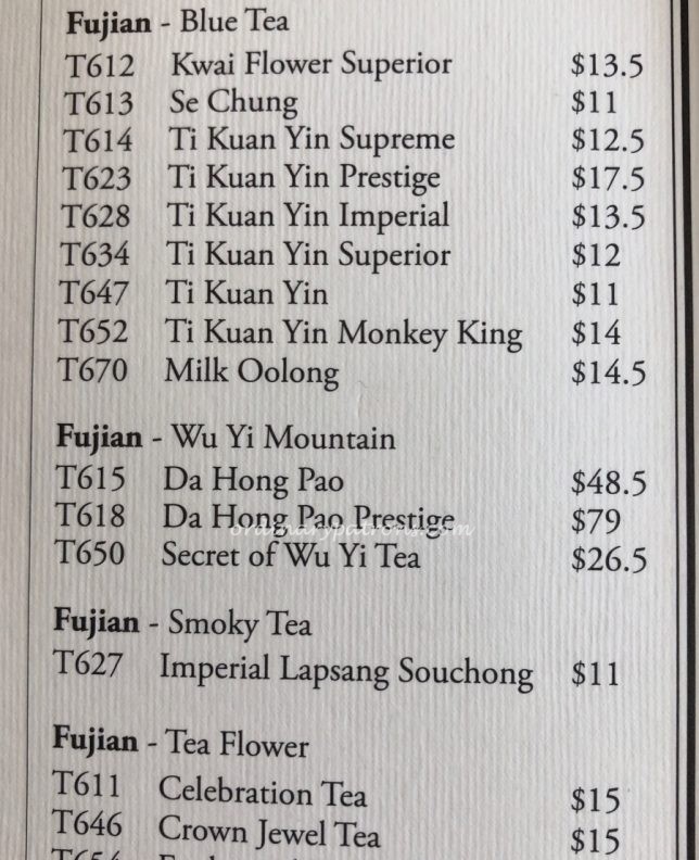 The first thing that was handed to us was the TWG Tea List. It contains hundreds of types of tea. Based on my quick scan, the cheapest was $11 per pot. The most expensive tea on the list was Da Hong Pao Prestige from Fujian, China which cost $79. Here are some sample pages of the tea list.