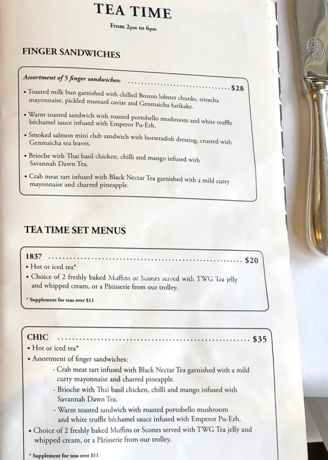 The entrance to TWG Tea Salon Takashimaya is small and narrow. We go in and the TWG salon reveals itself as an L-shaped space. It is ornately furnished with lots of bling and chandeliers. It is attractive in an opulent sort of way. But the space felt cramped. Some of the tables were very close to each other. We were fortunate to be seated at a table by the window. But the next table was inches away, a bit too close for comfort.