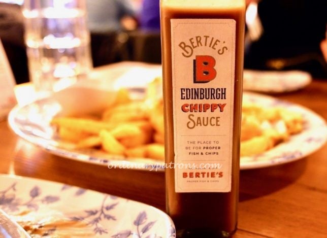 The dish was served with a small dish of tartare sauce. But we found that the fish tasted even better with the Bertie’s Edinburgh Chippy Sauce. We discovered that this brown sauce is often used in the Scottish capital in place of the usual vinegar and salt. It is said to be made with spices and fruits. For more information on it, read this article in the Edinburgh News “Shocking secret of Edinburghโs chippy sauce revealed“.