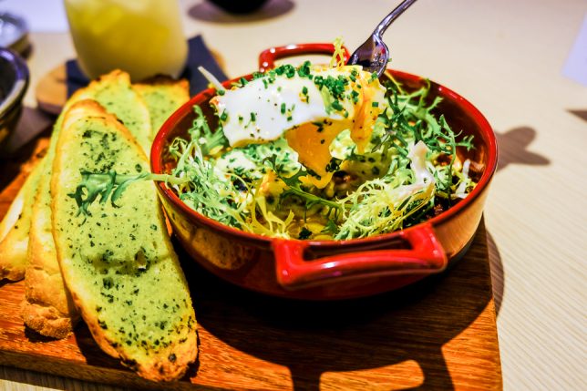 The Spicy Baked Eggs With Tomatoes of Poulet + Brasserie was served with crusty garlic bread. The dish was tomato concasse (tomato that has been peeled and chopped) mixed with spicy chorizo bits and topped with baked eggs with runny yolk. It was delectable eaten on its own and was also a delightful dipping sauce for the bread.