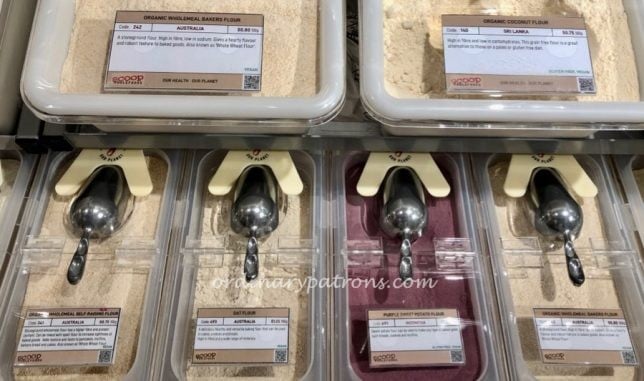 The numerous types of flour available, including organic coconut flour from Sri Lanka ($1.25 / 100g) and purple sweet potato flour costs $2.50/100g (picture below).
