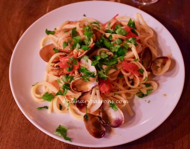 We tried the Bongole Rosso pasta (1,900 yen). It was a messy plate of linguine vongole. The taste was good, but this was the least attractive plate of pasta we have ever seen in a restaurant. It looked like something I would do at home – just scoop it all up onto a plate and Let it Be.