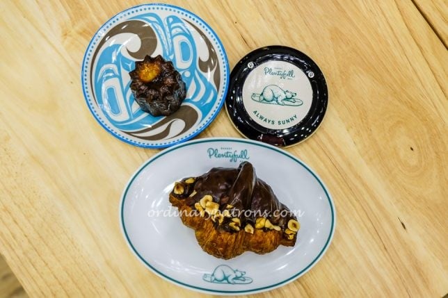 Here are pictures of the Plentyfull Bakery & Deli menu at Great World City. The range of food items on the menu is quite limited, with items mostly related to the bread baked at the kitchen. As we already had lunch we confined ourselves to the snacks. We selected a canele ($3.50) and a Croissant Choco Glory ($4.80) with our coffee.