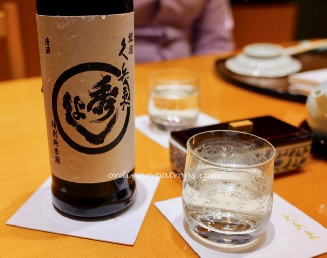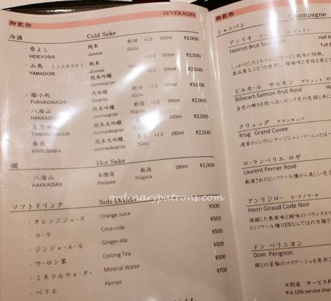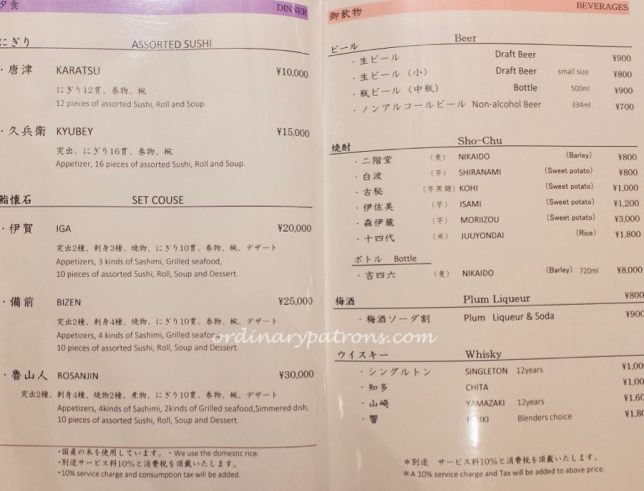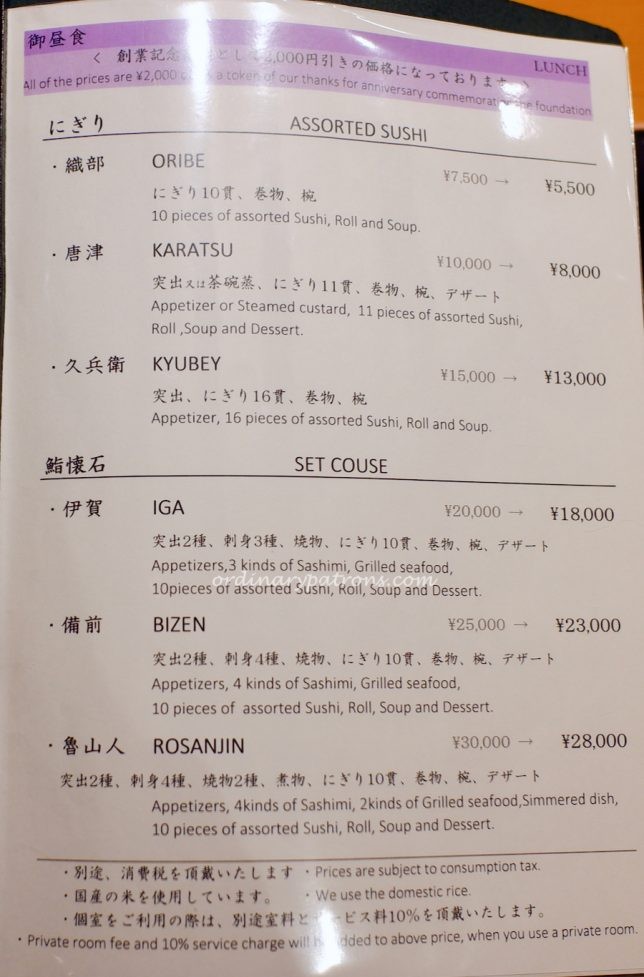 We had a pleasant surprise when we saw the menu. A 2,000 Yen discount was given to celebrate the restaurant’s anniversary. Here are pictures of some pages from the Kyubery Ginza lunch, dinner, drinks menus. We decided on the most basic lunch option – the Oribe assorted sushi that normally costs 7,500 Yen.