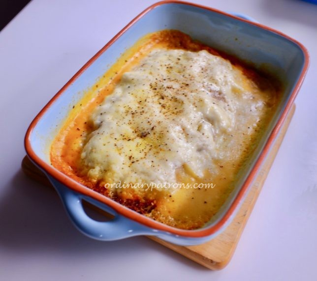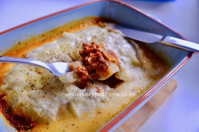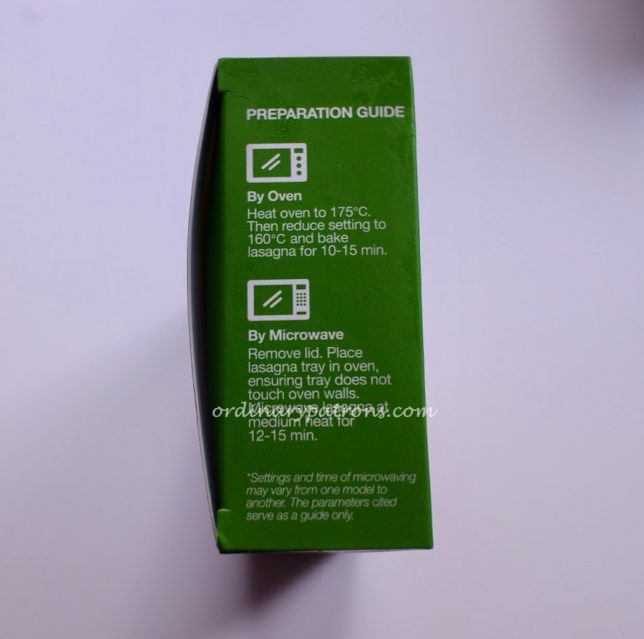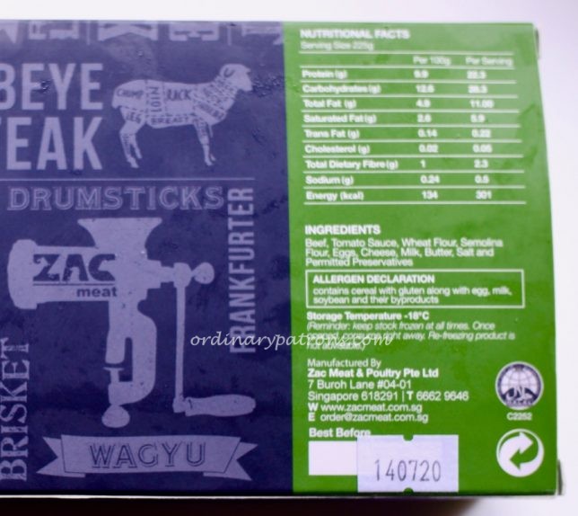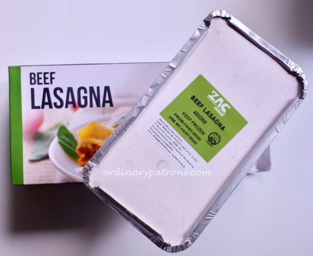 Looking at the packaging, the ingredients looked like that of regular lasagna – beef, tomato sauce, eggs, cheese etc. The only thing that stood out was “Permitted Preservatives”. I don’t know what that is but I guess some preservative is not unexpected in a frozen food item. ZAC Meat Beef Lasagna is manufactured locally by a company known as Zac Meat & Poultry Pte Ltd at Burch Lane, Singapore.