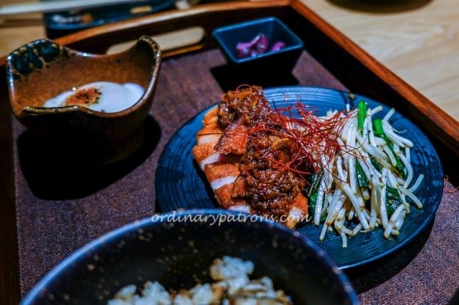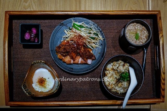 The charcoal grill set lunch (picture below) was served with chawanmushi instead of the soup. For the main dish, there was a choice of unagi or pork cheek. We decided on the latter. The chawanmushi had a topping of minced pork with lots of truffle oil. The truffles taste was too overwhelming. The grilled pork did not have much taste or texture. The almost sambal-like chilli paste salvaged it somewhat. We liked the other set lunch better.