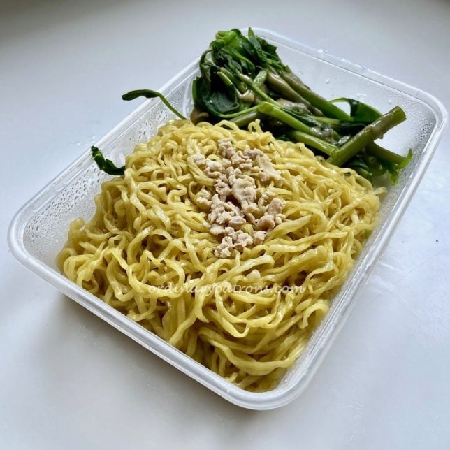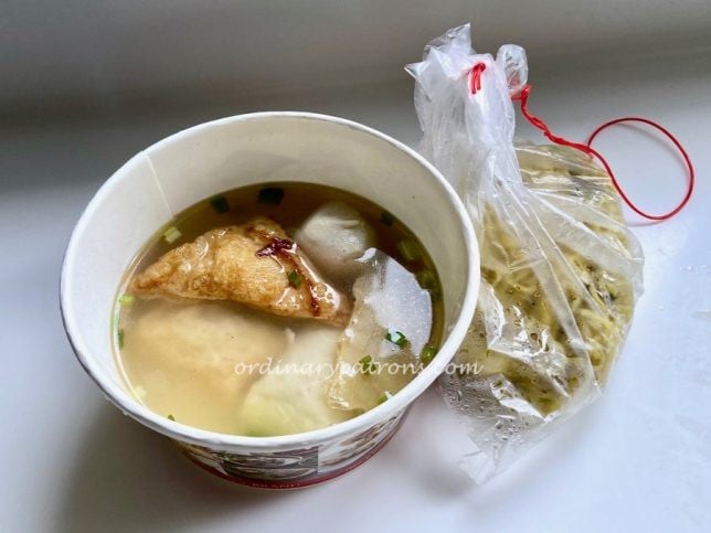 The yong tau foo set arrived intact. The dry noodles with a bit of minced meat topping and vegetables would make a great combination with the yong tau foo soup. But because the laksa yong tau foo went MIA, we improvised and released the other bag of noodles into the soup to make a soup noodle combination.