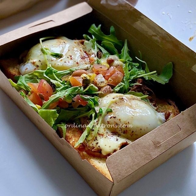 The food survived their journey home quite well. The Eggs Benedict arrived in perfect condition as it was snugly packed. The pasta had too much space in the box, got tossed about a bit and arrived slightly messy. The cruffin did ok but had parts of its topping stuck on the paper bag.