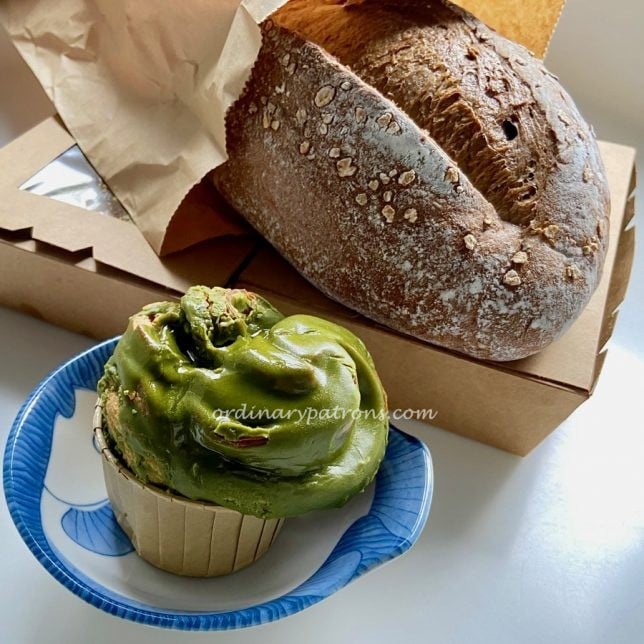 The Bread Yard Takeaway Menu can be accessed online https://order.breadyard.com.sg/. Breads and pasteries are their specialities. The more substantial food items are casual Western food classics such as sandwiches, “brunch food” such as Eggs Benedict and Shakshuka and pasta. Having had quite a few Asian takeaway meals recently, we decided to have a Pulled Pork Eggs Benedict ($14), a Prawn & Bacon Aglio Olio ($12), some bread and a Matcha Cruffin.