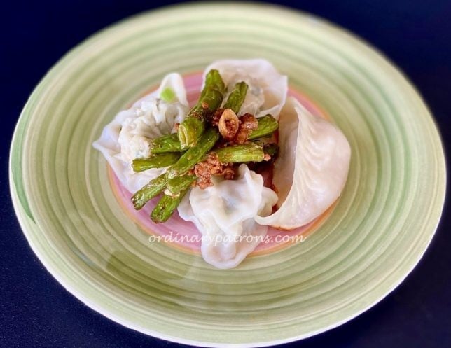 We had browsed the Imperial Treasures Shanghai Takeaway Menu and concluded that the dumplings looked like the most interesting. For contrast we ordered the fried long beans. That turned out to be a good decision as the beans provided contrast, both in terms of looks as well as flavour and texture to the dumplings.