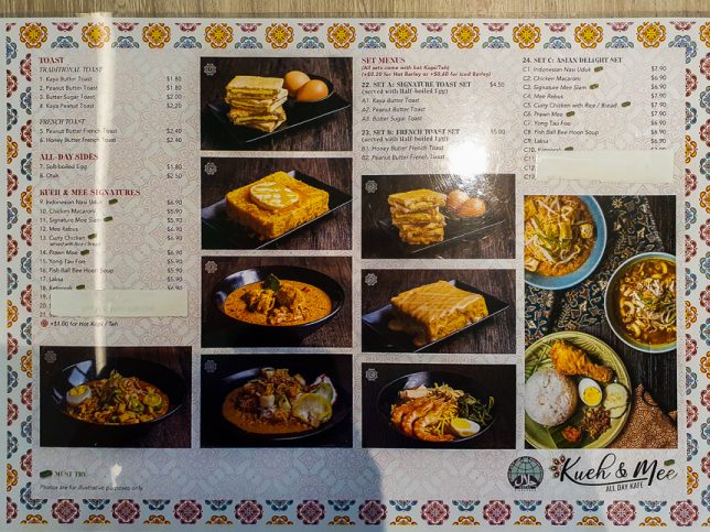 The Menu of Kueh & Mee actually offers more than just Indonesian kuehs and noodles. There are nasi uluk, curry chicken, yong tau hu and various other local and Asian delights as well as toasts and eggs.