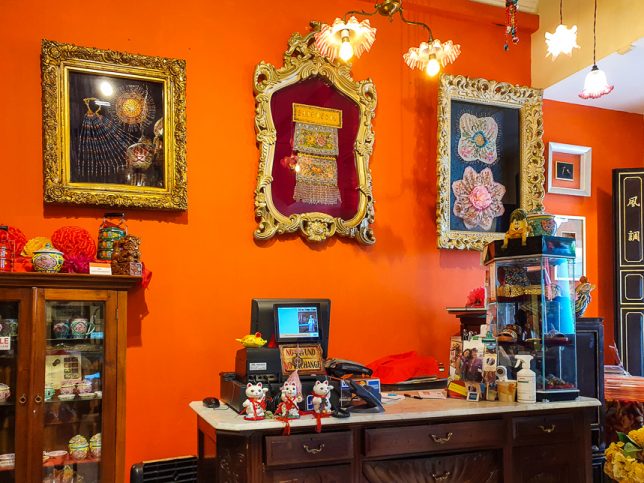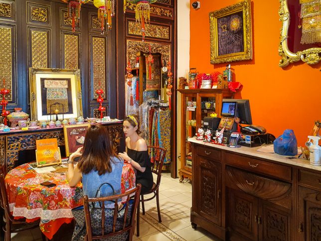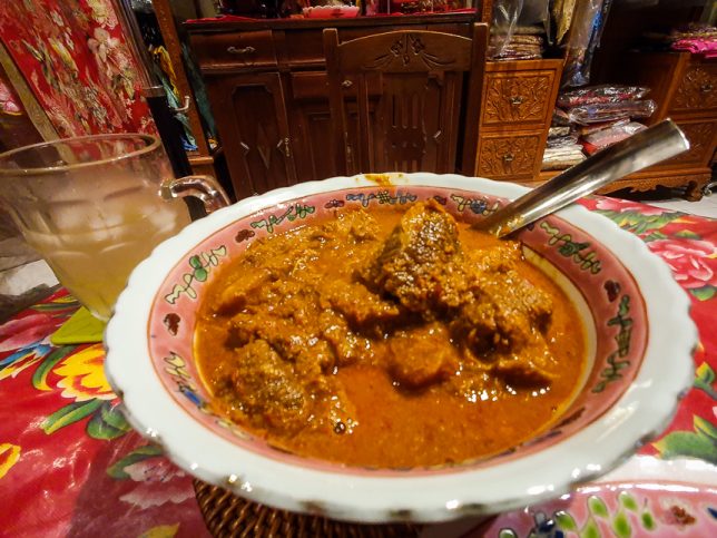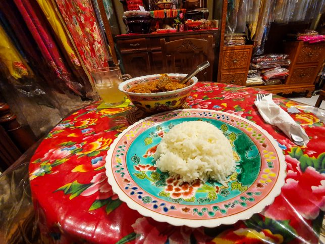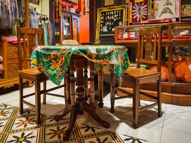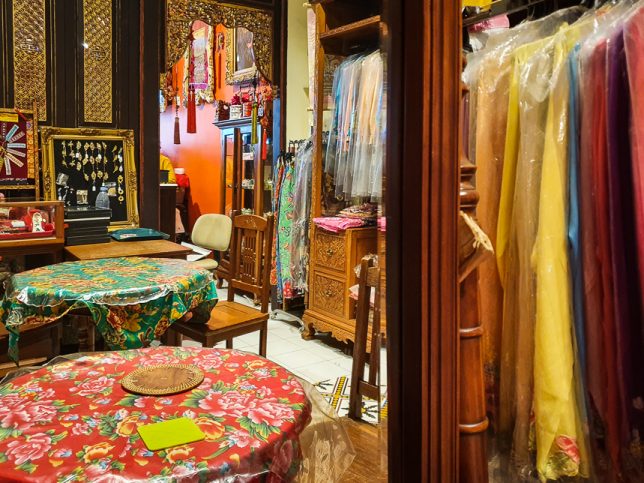 There are a few small tables among the sarong kebayas, beaded slippers and jewelry for sale. Eating at those tables is like eating in someone’s cluttered home.