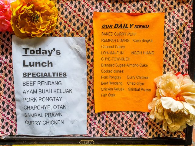 The Daily Rumah Bebe Menu and Today’s Lunch Specialties are simply printed on pieces of paper and affixed on a notice board outside the shop.