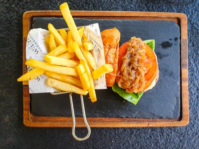 The thick ground beef patty was cooked to the doneness specified. It was topped by thick juicy slices of tomatoes and lots of carmelised onions. The brioche bun was lightly toasted. It was a yummy burger. Just be warned that you won’t be able to eat it elegantly – expect a messy plate half way through the big juicy burger.