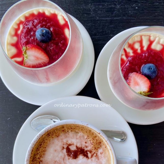 There was only one dessert on the menu and so we both had the Panna Cotta with Blueberries. We normally are not so keen on panna cotta as it is pale both in looks and taste. In this case the panna cotta was enhanced with a layer of what tasted like strawberry jam. It added the necessary colour and taste to the dessert. There was a choice of coffee. We selected cappuccino which was very good.