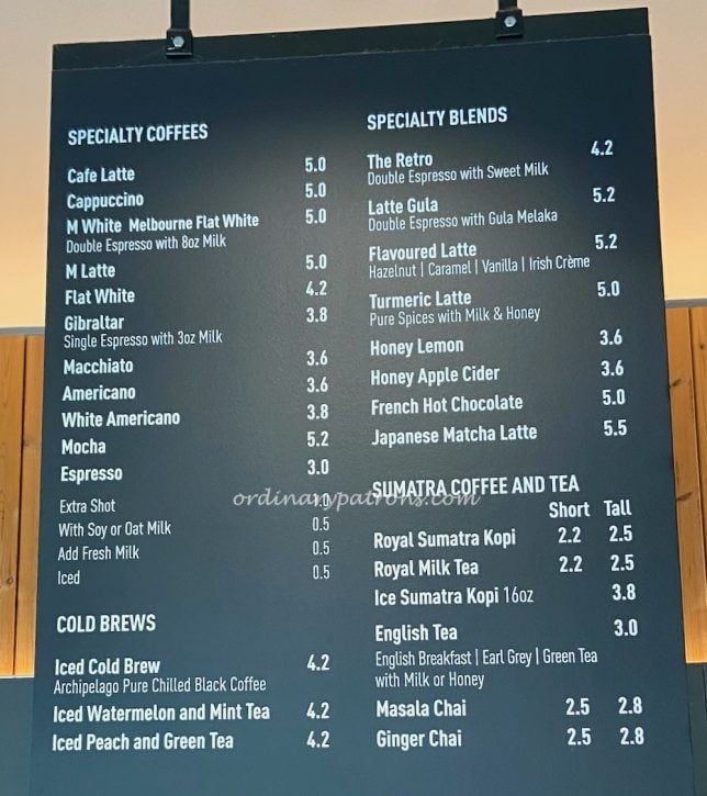 But I think the main attraction to the many customers that stop by at Huggs is their coffee. In addition to coffee from the espresso machine, they also have Sumatra coffee which I believe is their version of local Singapore coffee. Priced at around $2.50, it is not as expensive as the lattes or cappuccino, but more pricey than a coffee shop cup of coffee. Here is a picture of the drinks menu