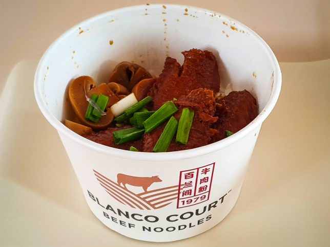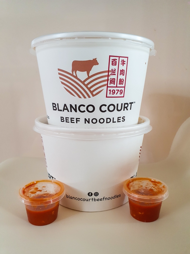 Blanco Court Beef Noodles operates as a standalone restaurant in Aperia Mall. In other locations, the noodle stall is part of the Food Republic food court. Delivery service is available via various food delivery platforms.