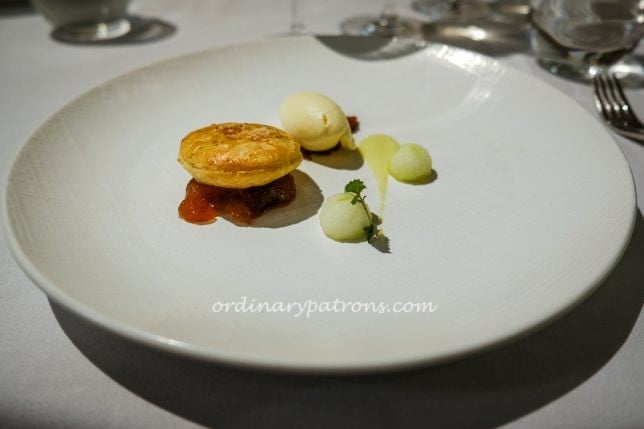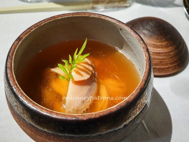 The first two starters featured premium seafood. Raw Hokkaido scallop was prepared with Oscietra caviar and apple snow (picture above). Following that was a consomme dish featuring somen (very thin Japanese noodles) and greenlip abalone. Both starters were delicate and exquisite.