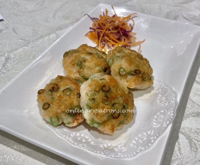 The roast pork ($12, picture above) was quite ordinary and was the least liked item of the lunch. We found the crackling skin too dense and hard. We tried two other common dim sum items – baked BBQ Kurobuta pork pastry ($5.80) and deep-fried bean curd skin with prawn ($6.80, pictures below). These were better and comparable to similar items from Chinese restaurants in Orchard Road.