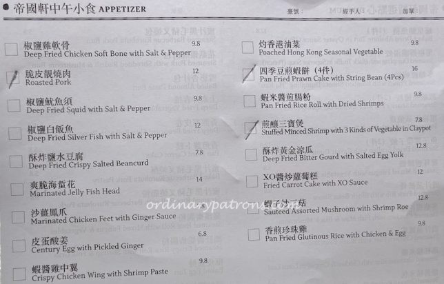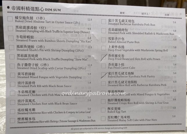 The Empire Chinese restaurant is a full service restaurant with a comprehensive Chinese cuisine menu. The a la carte menu contains expensive Chinese banquet classics like sharks’ fin, birds’ nest, abalone etc. But there are also regular Chinese restaurant dining items that are more affordable. We were there for a quick lunch and focused on the dim sum menu (pictures below).