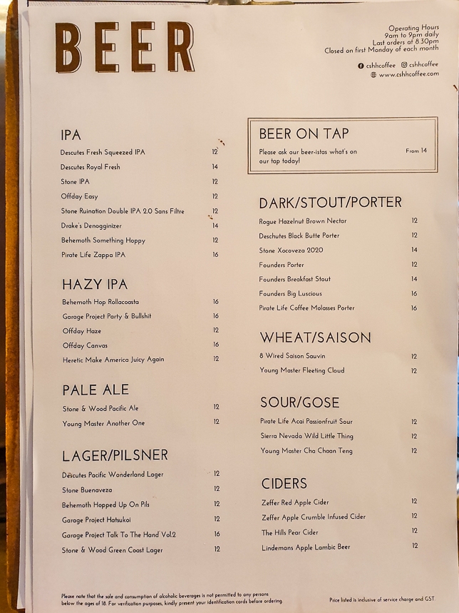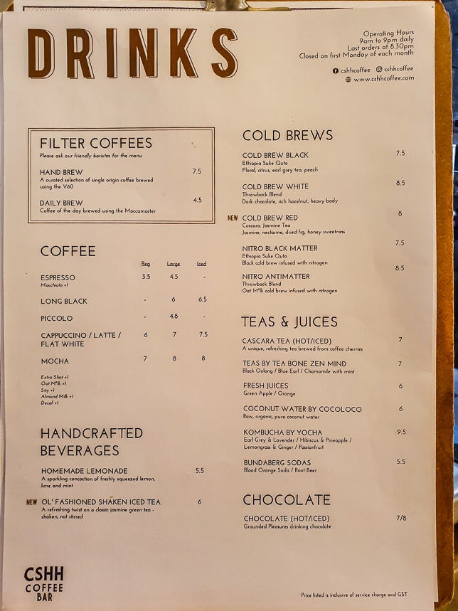 The Drinks Menu of Chye Seng Huat Hardware is obviously dominated by coffee – hand brew, cold brew, with milk, with soy etc. There are, however, also tea, chocolate and juices as well as stronger stuff like stout and beer.
