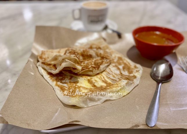 The Cafe O Prata Meal consist of a cup of coffee and two pieces of prata, one ‘kosong’ and one egg prata, accompanied by some curry.