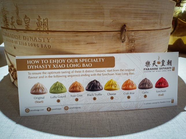 Paradise Dynasty 乐天皇朝, part of the Paradise Group of restaurants, serves both northern and southern Chinese cuisine. It is perhaps most well known for its colourful Xiao Long Baos.