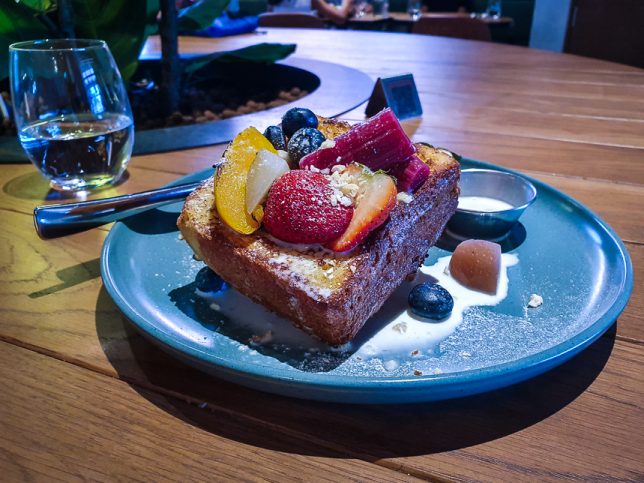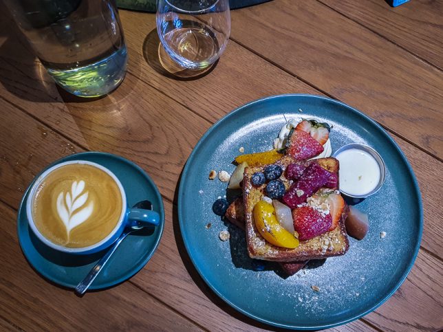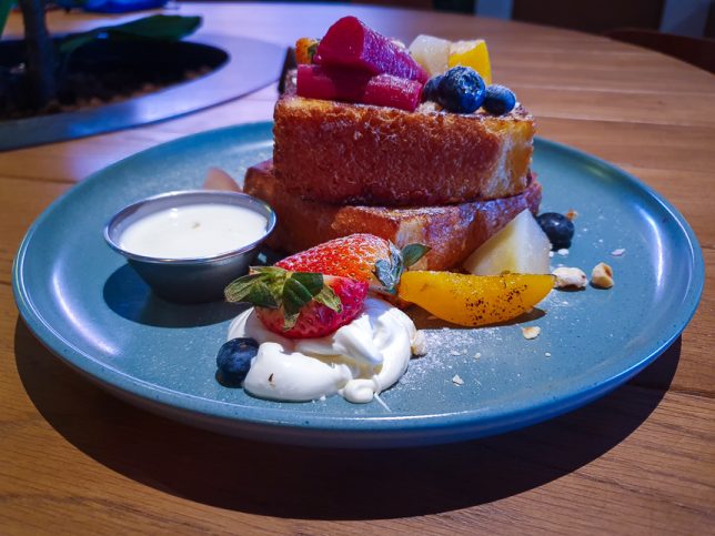 The French Toast was hipster cafe standard – nice thick and fluffy brioche topped with a colourful mix of poached pear, grilled peach, rhubarb, strawberries and blue berries. The interesting addition was sweet almond flakes which provided a contrasting texture. The French Toast of FOCR looked good and tasted good.