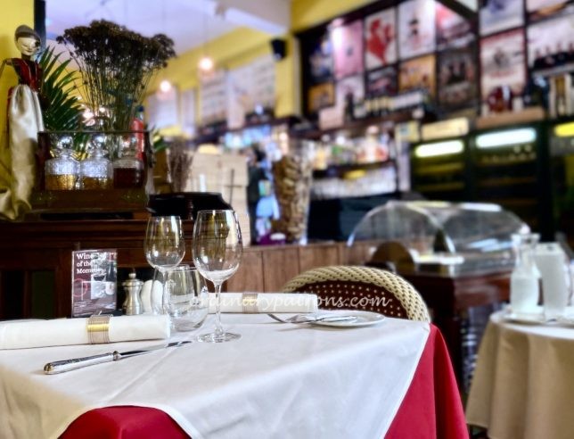 Once inside the restaurant, the bright yellow walls and multitude of posters and other paraphenalia on display are a feast for the eyes. The rattan bistro style chairs are attractive but we thought that they were not very ergonomic. Crisp white linen always elevates the dining experience.