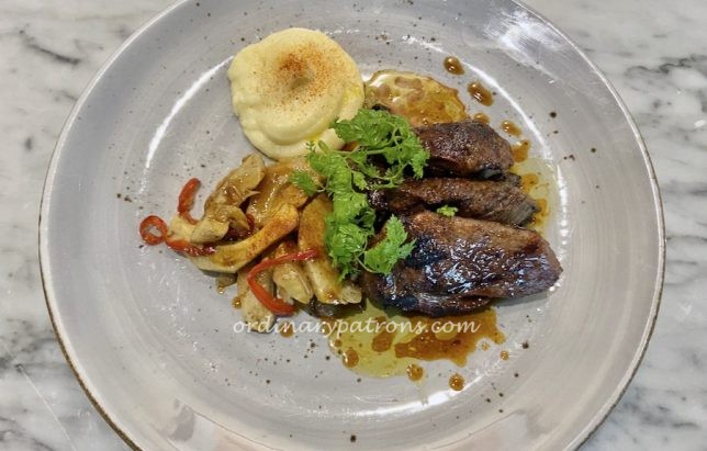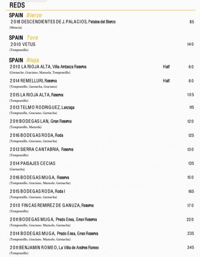 The restaurant currently has a 20% discount on wines by the bottle (until July 2021). We selected a half-size bottle (375 ml) of Spanish wine from the Rioja region. Priced at $60 before the discount – it was a nice red Spanish wine that was very drinkable straight out of the bottle.